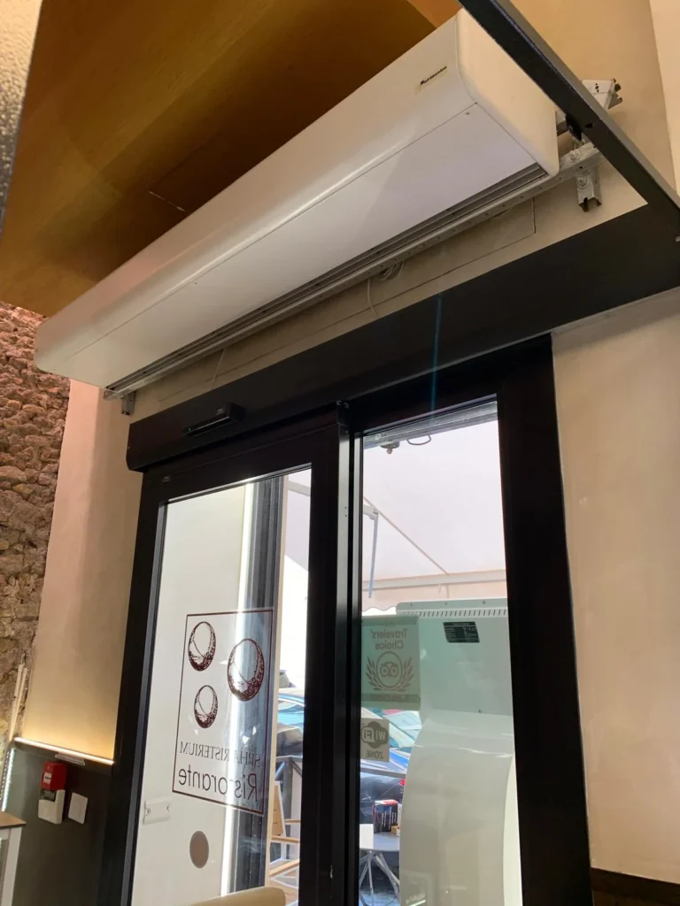 Sistemas integrados que combinan barrera de aire con calefacción, ideales para zonas con bajas temperaturas. Ofrecen cortina eficiencia energética mejorada al proporcionar aire caliente dirigido.